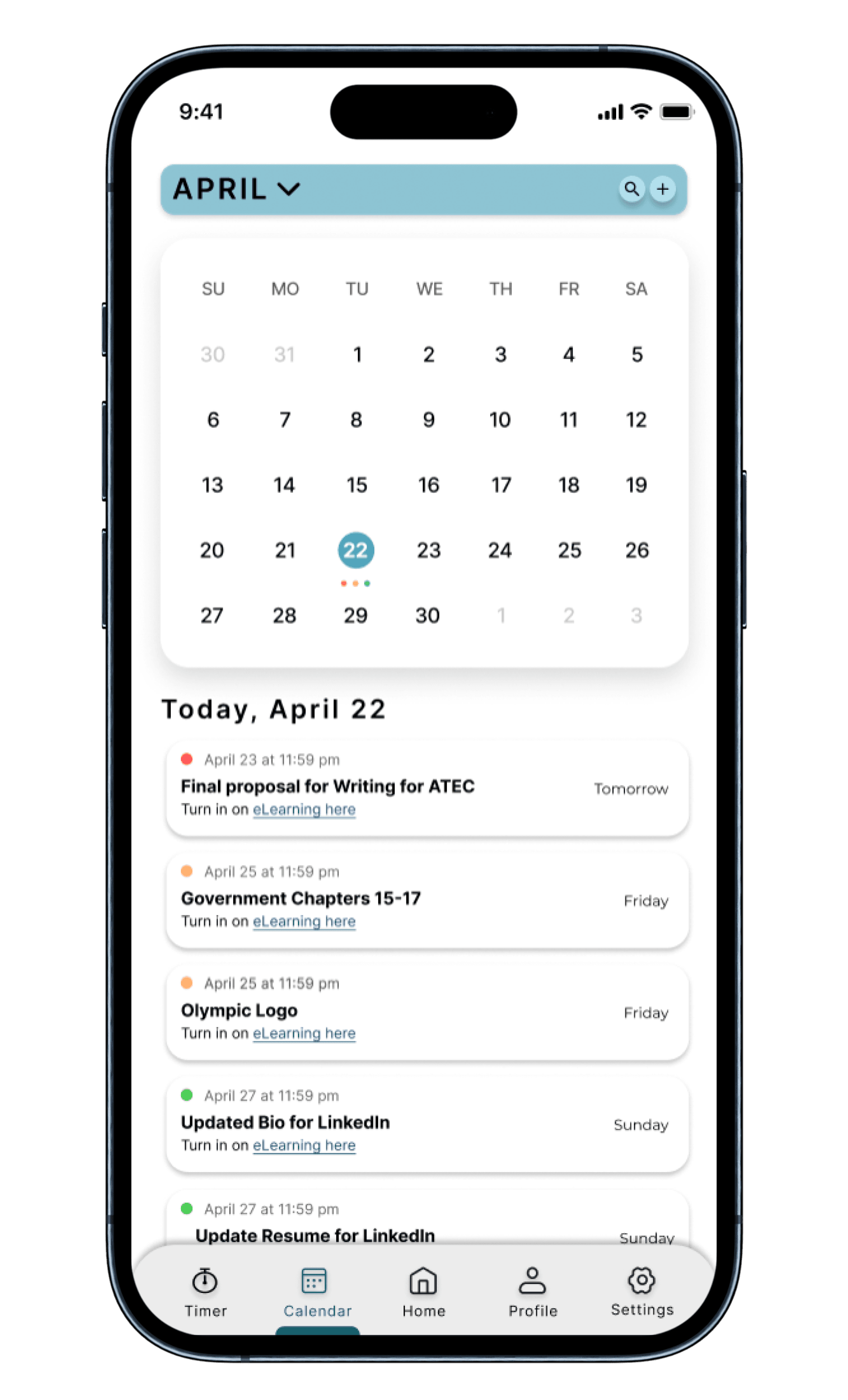 Instead of switching between multiple platforms, students can view and track their assignments in one place. Synced deadlines appear in the calendar, and each task includes an in-app link to the submission page, reducing friction and helping students stay on top of their work. A visual urgency system with color-coded dots highlights what’s most time-sensitive, while a streamlined task form makes it easy to add new items without overcomplicating the process.