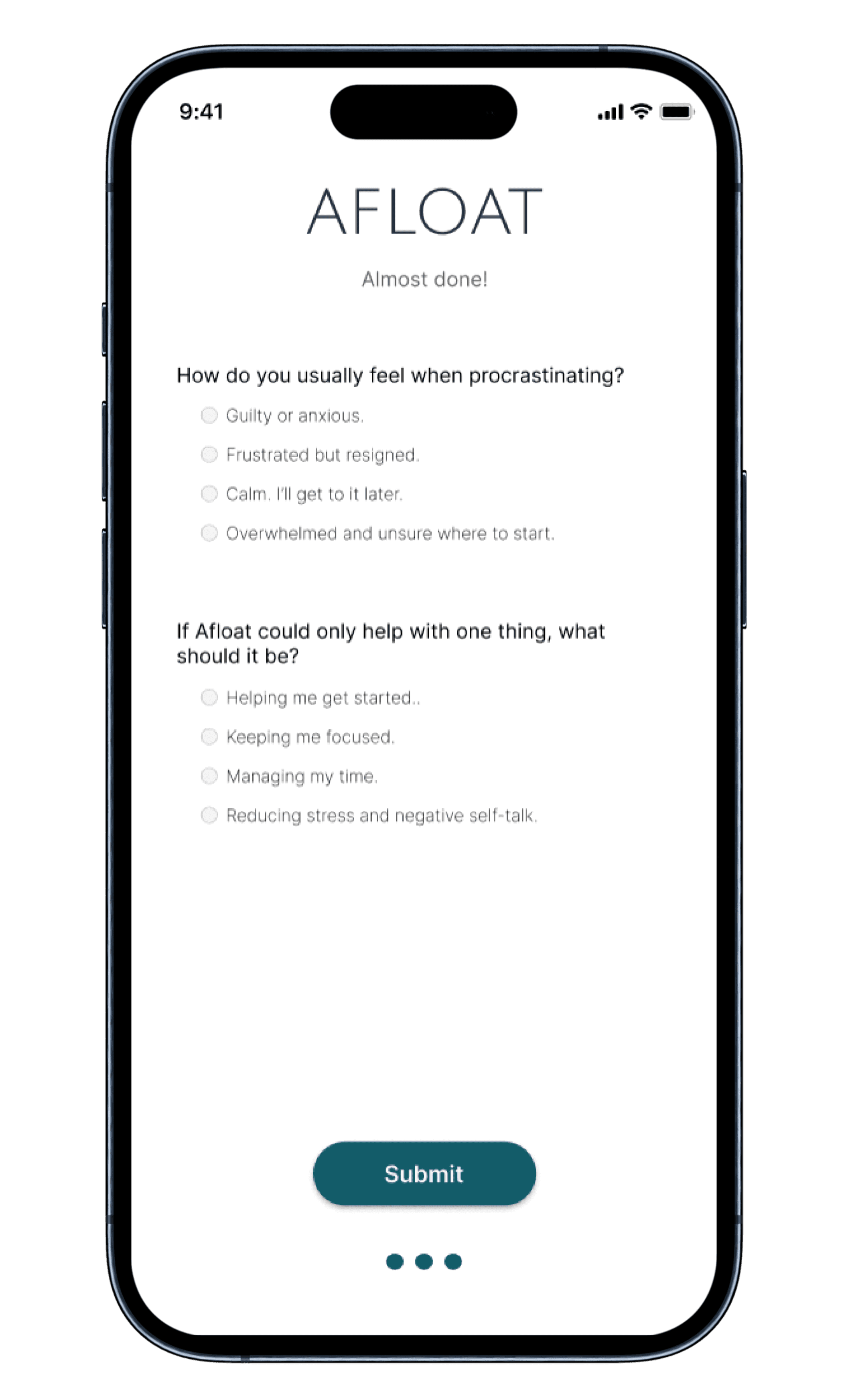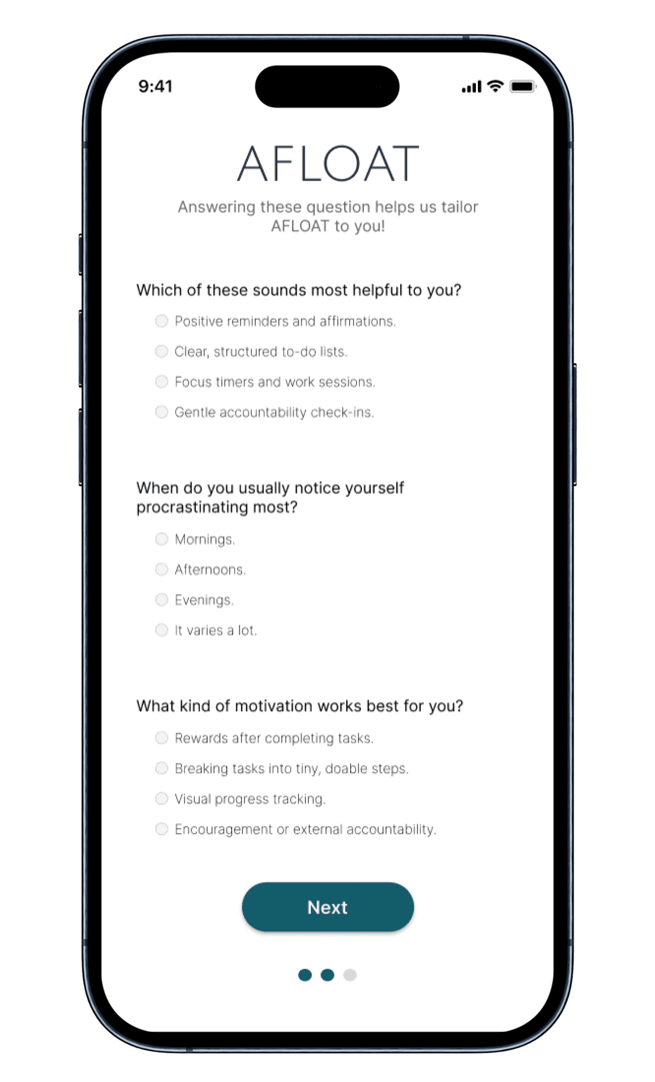 AFLOAT is a productivity and mental wellness app created to help students overcome procrastination through emotional support and structured planning. It goes beyond simple to-do lists by offering personalized affirmations, adaptive scheduling features, and a calming, intuitive interface that encourages consistent use. The goal was to address the emotional causes of procrastination while keeping the user experience stress-free.
