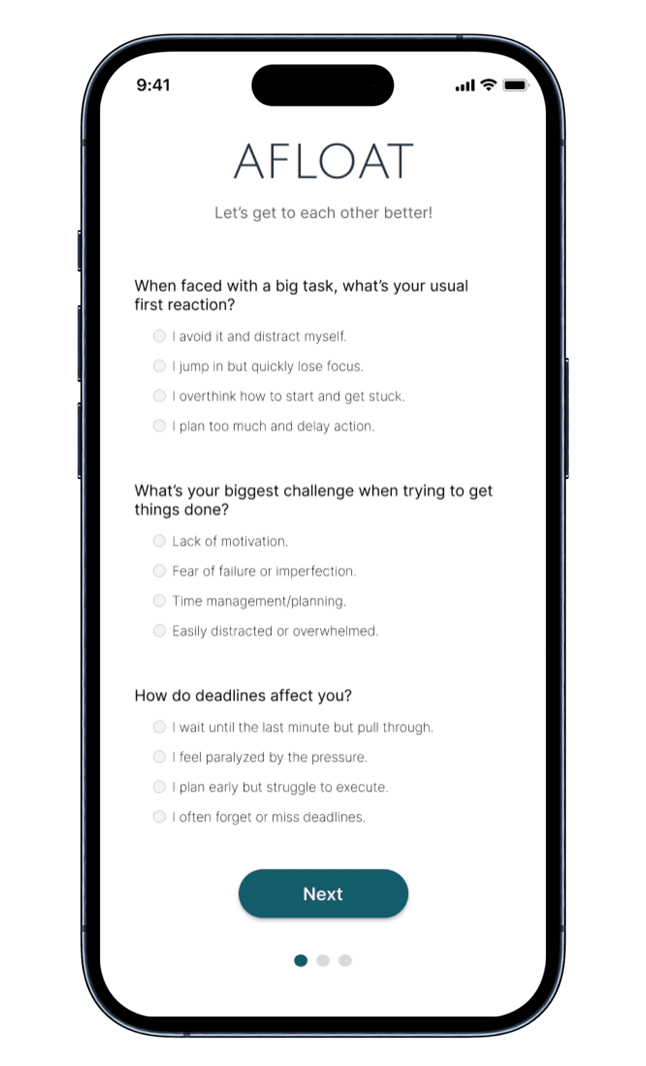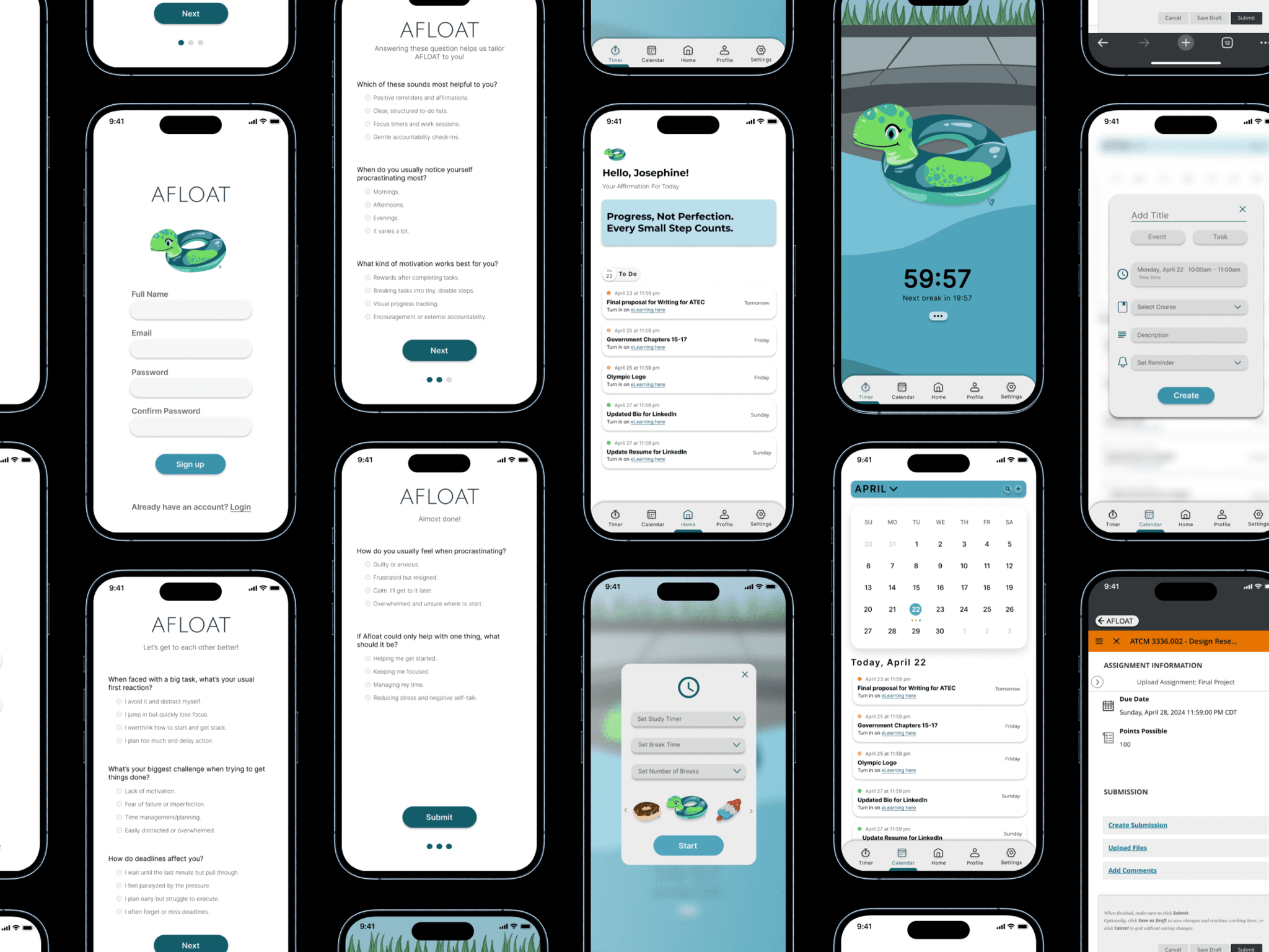 From the start, the project aimed to create a tool students could rely on when procrastination felt heavy. AFLOAT was intended to be intuitive, supportive, and low pressure — a space that reduced mental friction rather than added to it. The focus was on gentle structure, emotional reinforcement, and features that could help students build momentum without feeling overwhelmed.