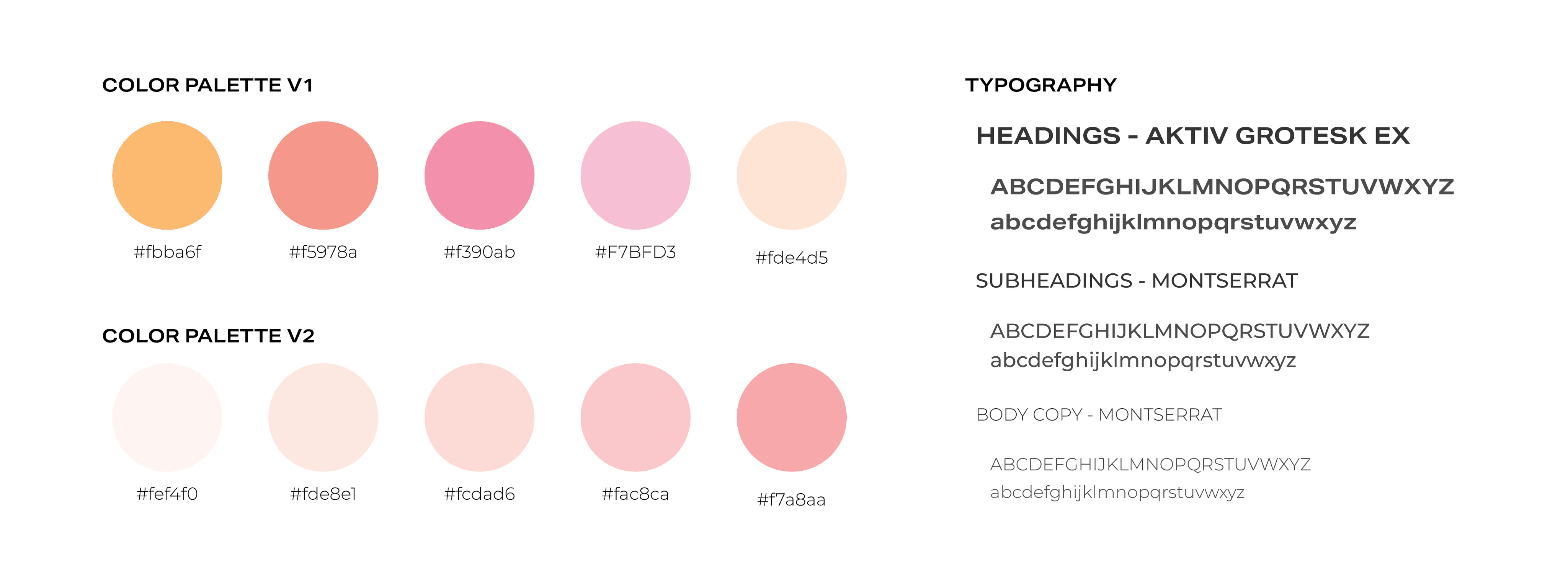 For headings, I selected Aktiv Grotesk Ex, a clean and modern typeface with subtle character that adds strength without overpowering. Montserrat was chosen for body copy, offering clarity and versatility while maintaining a welcoming tone. Together, these typefaces create a balanced typographic system that complements the brand’s color palette and overall personality.