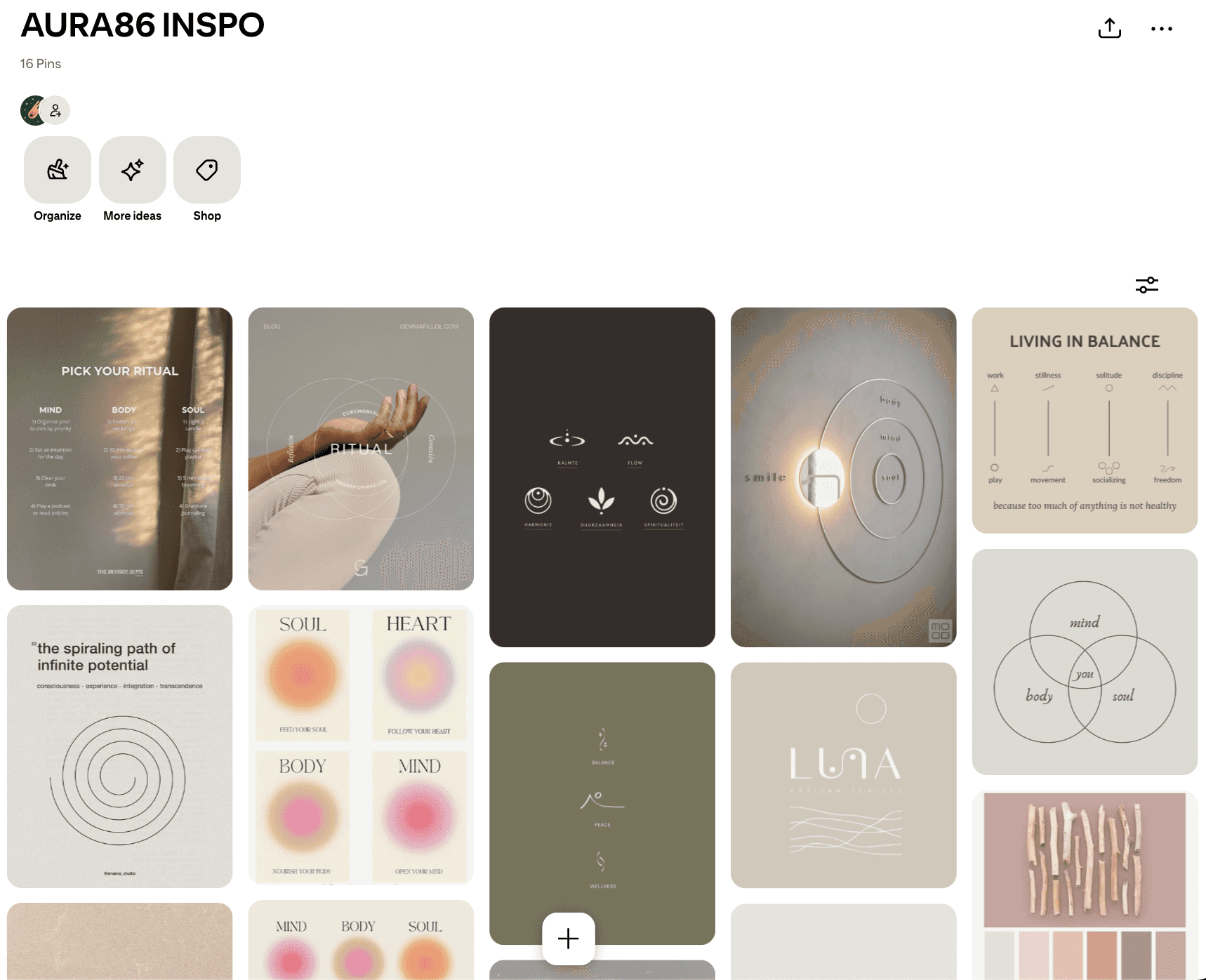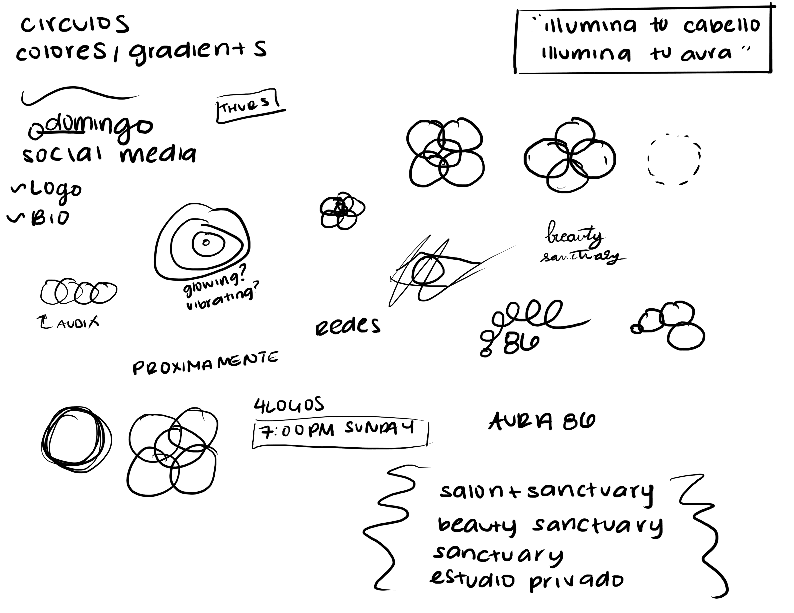 To kickstart the ideation process, I worked closely with the client to define the details of her vision. During our FaceTime conversations, I sketched in real time, translating her ideas into early shapes and layouts. I also asked her to curate a Pinterest board that captured the textures, colors, and moods she imagined. These early sketches and visual references became the foundation for developing the brand’s identity.