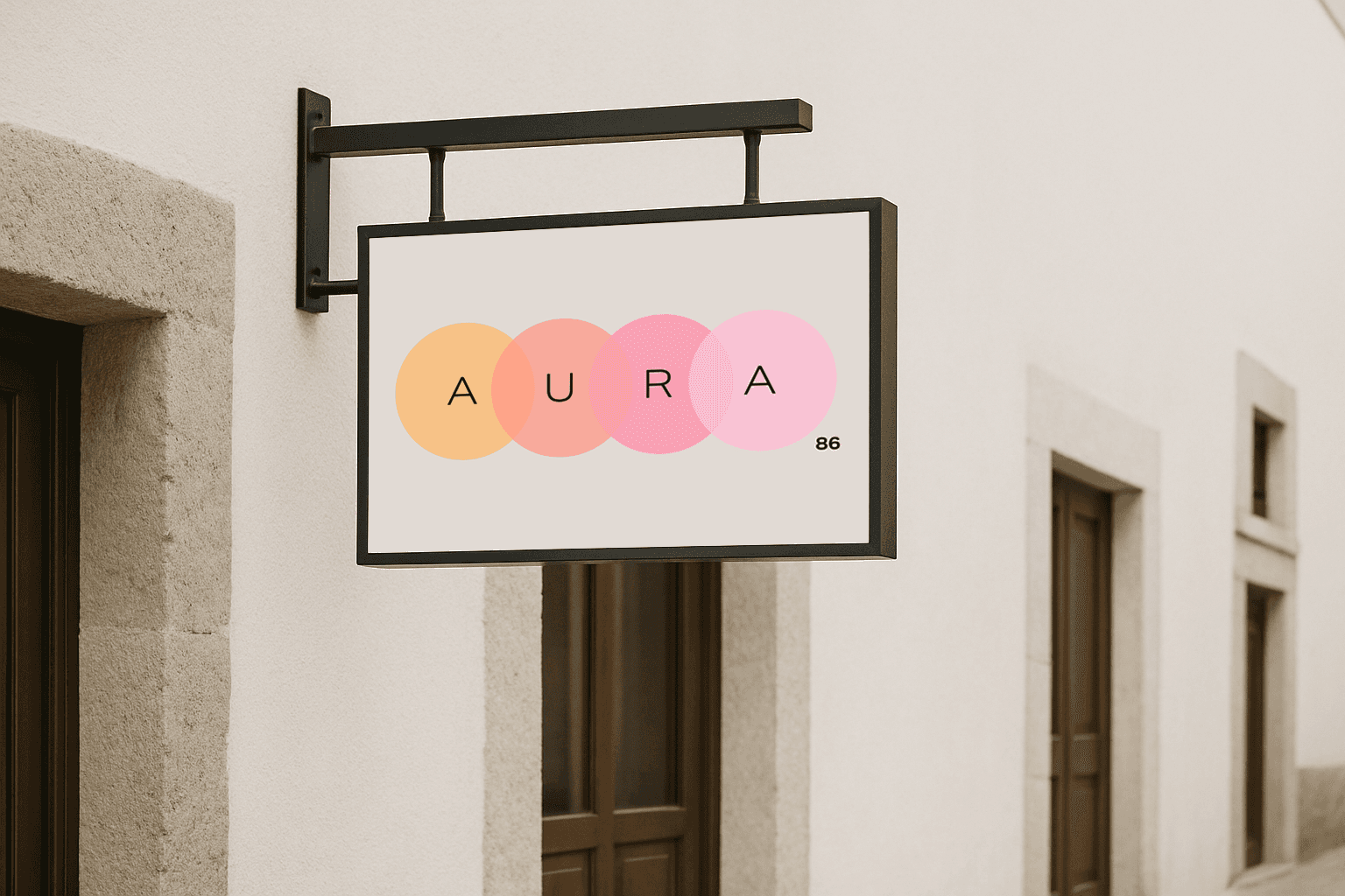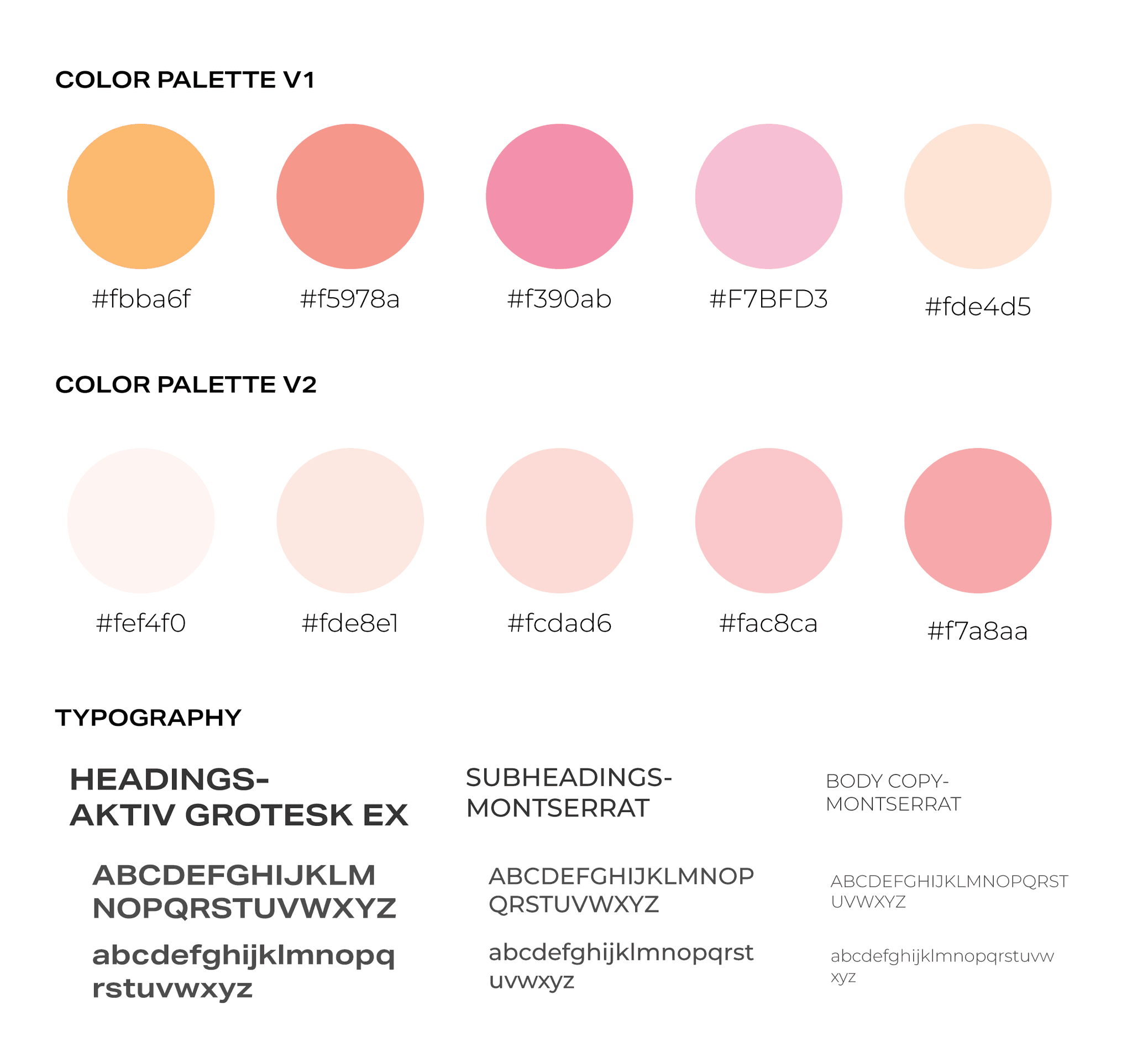 I explored two color directions for Aura86, each designed to reflect the brand’s sense of calm and balance. The palette showcased below — #fbba6f, #f5978a, #f390ab, #f7bfd3, and #fde4d5 — became my preferred choice for its warmth and depth, with tones that feel restorative yet vibrant. The alternate version offered softer, more muted hues (#fef4f0, #fde8e1, #fcdad6, #fac8ca, #f7a8aa) for a lighter, airier feel. Both were fully developed into brand kits, ensuring flexibility in the final application.